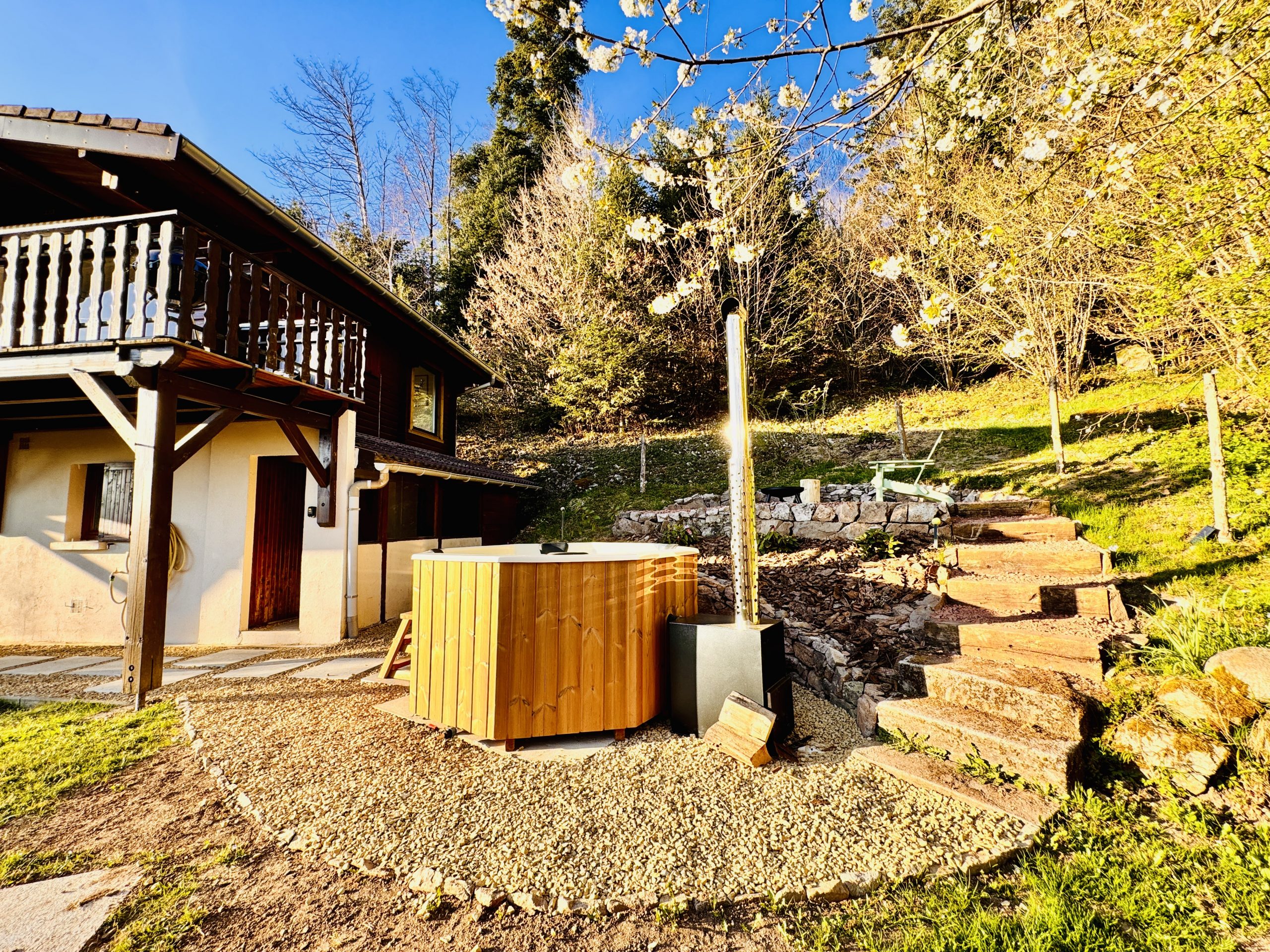 À l’extérieur, le chalet a été aménagé avec des équipements différenciants : terrasse spacieuse, coin brasero et bain nordique, renforçant l’attractivité du bien sur le marché de la location courte durée.