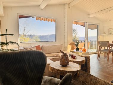 Un intérieur moderne, de grandes baies vitrées et fenêtres pour une immersion complète dans la nature, un extérieur avec coin brasero, bain nordique et une grande terrasse.
